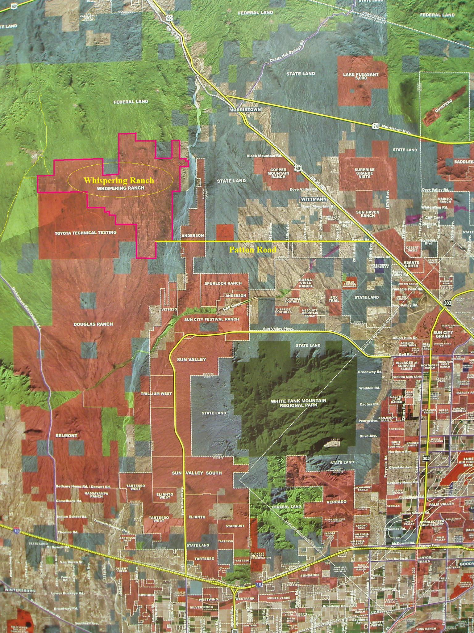 In the far West Valley, northwest of Sun City Grand and south of Wickenburg, you'll find plenty of raw desert acreage known as Whispering Ranch. This undeveloped land will become some of the most desirable and sought after property in Maricopa County as the growth of the area continues. It is located about 13 miles west of Grand Avenue on Patton Road, just west of Wittmann and the Hassayampa River. Situated in an Unincorporated area of Maricopa County, to the north and west of the Town of Buckeye, it encompasses approximately 19,000 acres (about 29 +/- square miles). It was originally subdivided in the late 1950's and early 1960's into approximately 3,400 five-acre parcels and 90 twenty-acre parcels. At the southwestern portion of Whispering Ranch you will find the Toyota Technical Testing Area (also known as Toyota Proving Grounds) occupying about 13,000 acres.